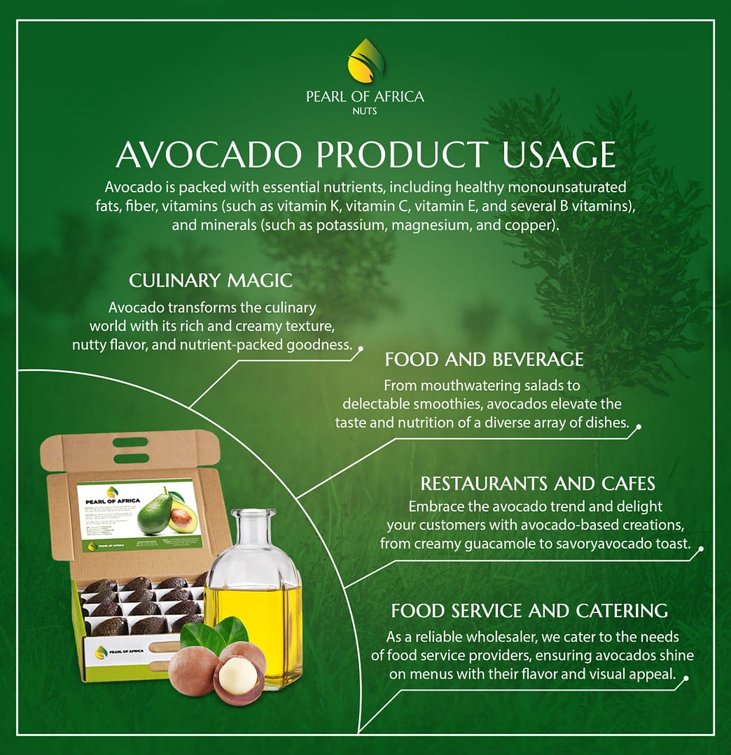 Wholesale Supplies: Pearl of Africa serves as a trusted wholesaler of avocados, providing reliable and high-quality supply to foodservice providers, caterers, and other industry professionals. Avocados are a staple in commercial kitchens, adding flavor, nutrition, and visual appeal to a variety of dishes.